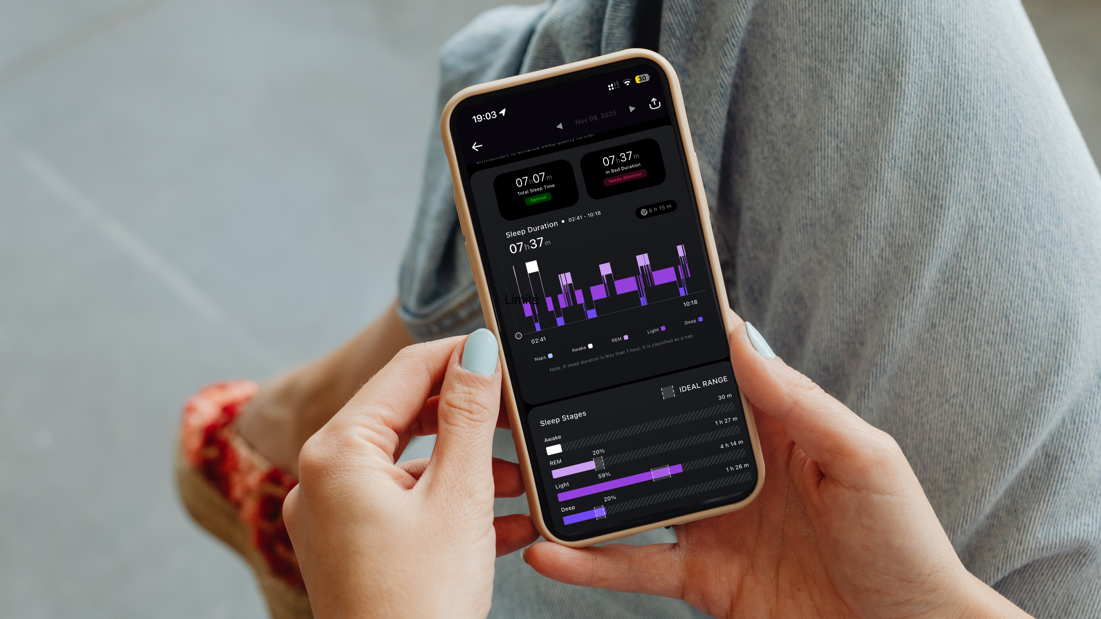 ✓ Detailed analysis of the 4 sleep phases with minute-by-minute graphs
