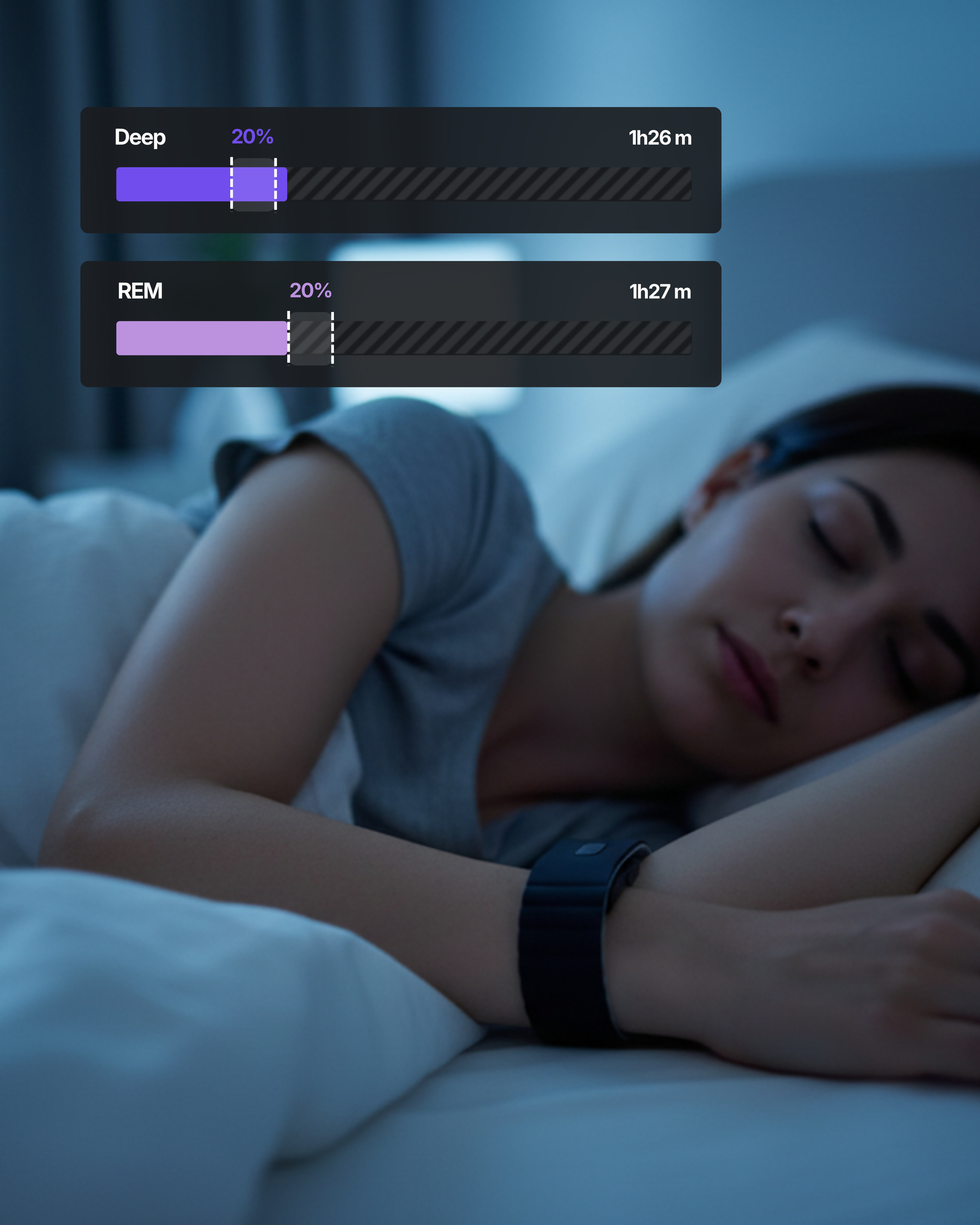 JYCEN analyzes your sleep phases (light, deep, REM), detects micro-awakenings, and measures your body temperature during the night. The AI suggests optimal bedtimes and personalized routines.