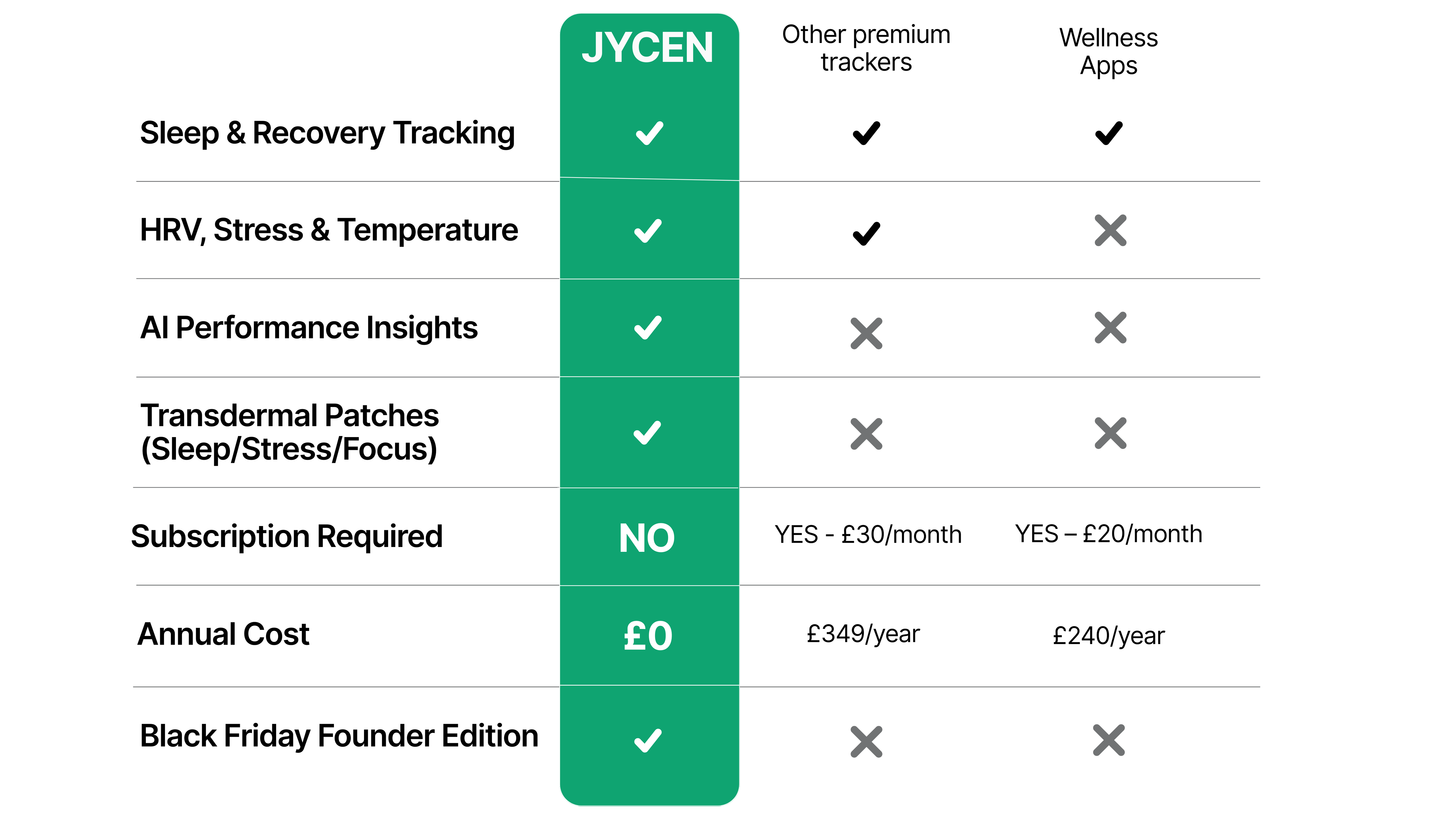 JYCEN 4.0 is a screenless health bracelet connected to the JCVital app. It continuously tracks your key signals (sleep, heart rate, estimated SpO₂, HRV, activity) and transforms this data into simple recommendations using an AI coach. With your purchase, you receive three free packs of SINNIO transdermal patches (Sleep+, Calm+, Focus+) to support sleep, stress management, and concentration. No subscription required. JYCEN is not a medical device.